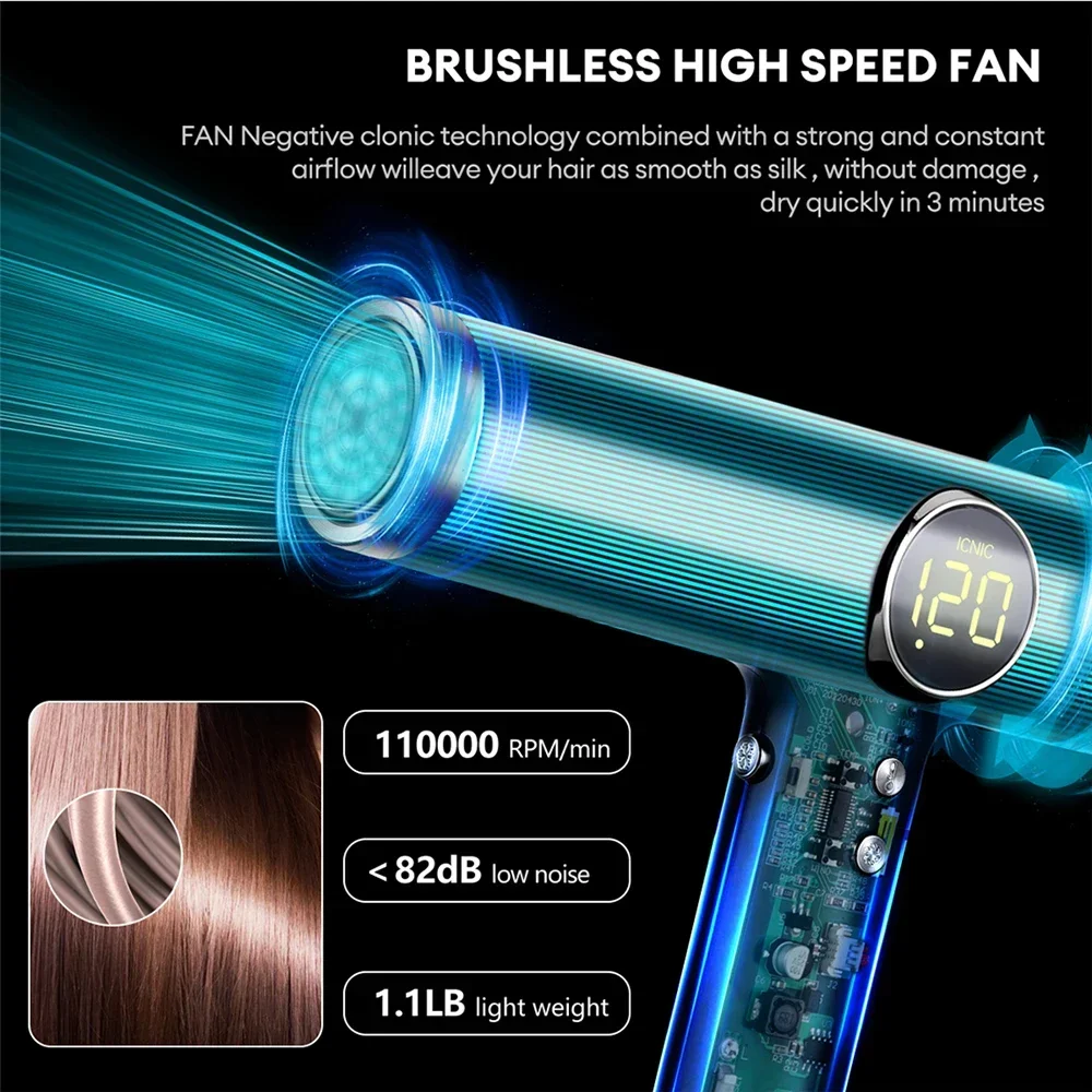 1.Using non-destructive air duct design, brushless DC motor, the speed is up to 110000RPM, the wind is strong, and the working noise can be reduced at the same time, and the drying time can be shortened by half.