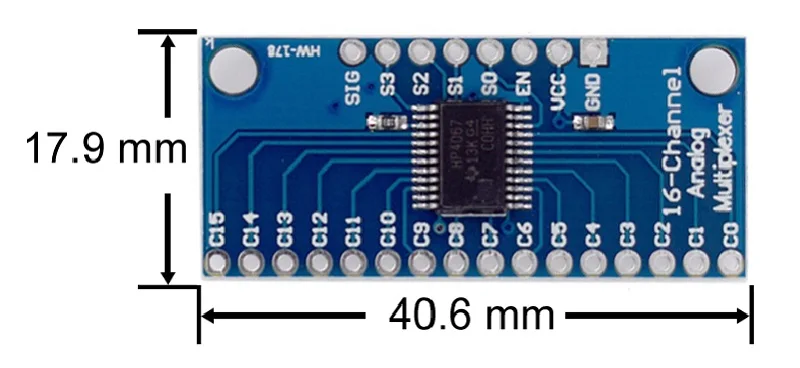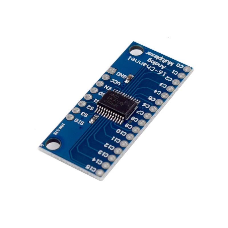 This is a 16 channel analog/digital multiplexer adapter board, and the chip is like a rotary switch – it is internally connected from a common pin (COM in the schematic diagram, SIG on the board) to one of the 16 channel pins. It is suitable for both digital and analog signals (voltage cannot be higher than VCC) and works in any direction. To control the module, the 4 digital outputs are connected to the chip’s address selection pins (S0-S3). 16 sensors can be connected to the system using 5 pins.
