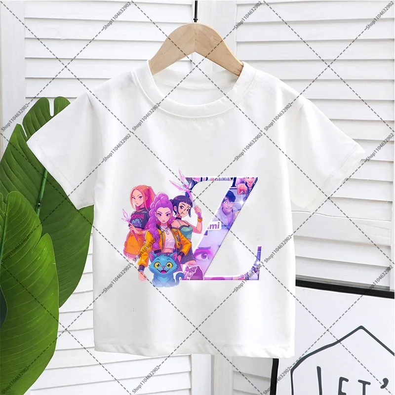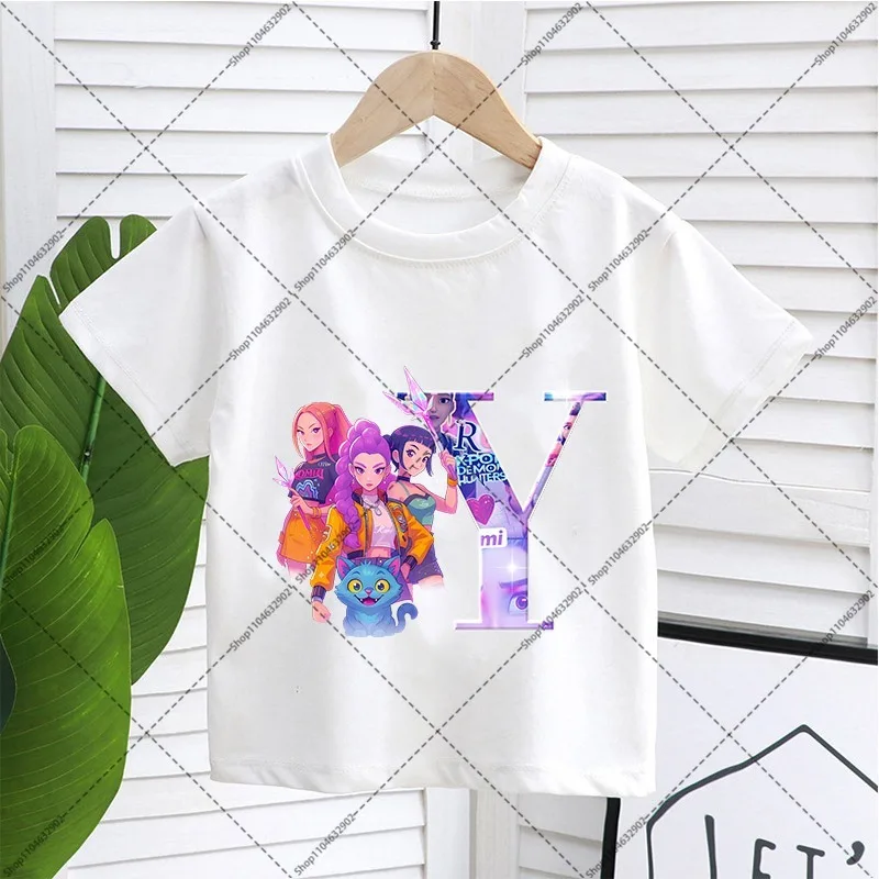 KPop Demon Hunteres Girls T-shirts Cartoon Anime Pattern Letter A-Z Tee Children Summer Fashion Clothes Kids Cute T-shirt Gifts