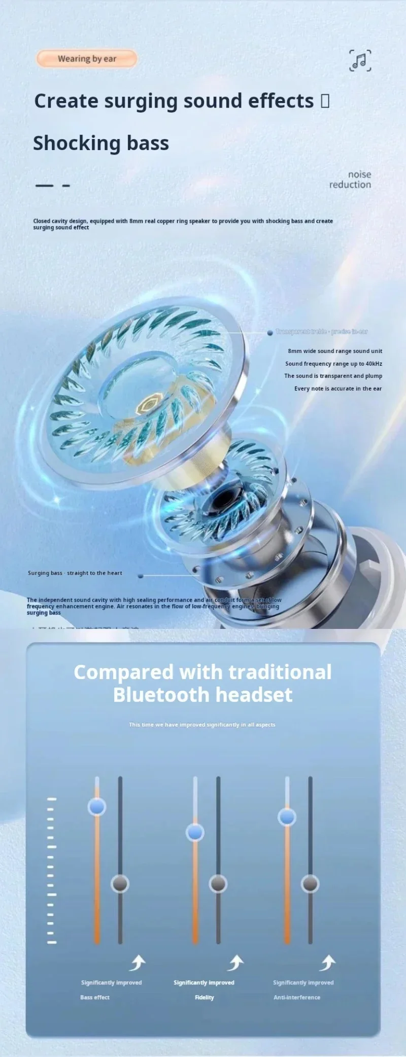 Closed cavity design, equlpped with 8mm real copper ring speaker to provide you with shocking bass and create surging sound effect