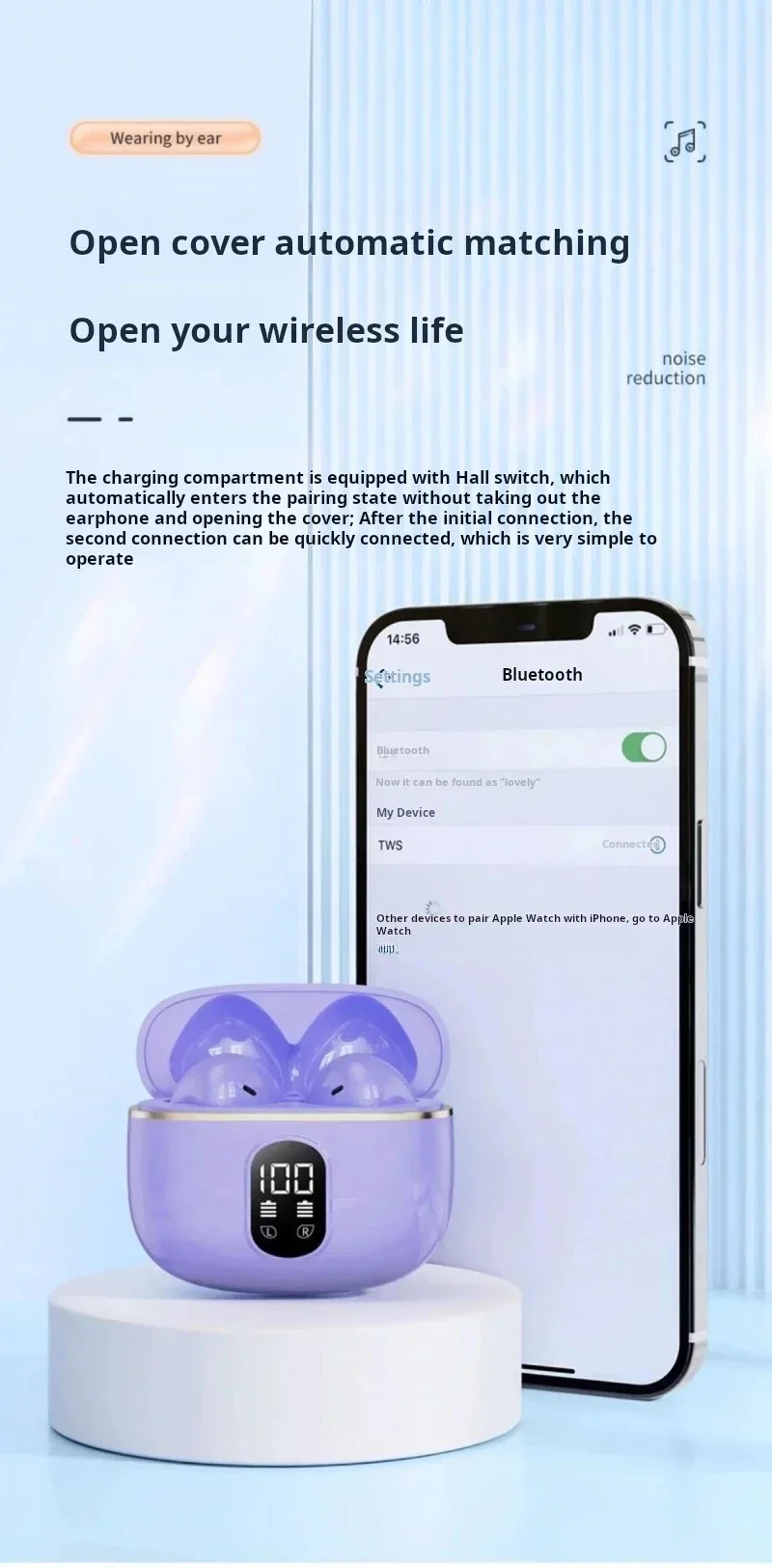 The charging compartment is equipped with Hall switch, which automatically enters the pairing state without taking out the earphone and opening the cover; After the initial connection, the second connection can be quickly connected, which is very simple to operate