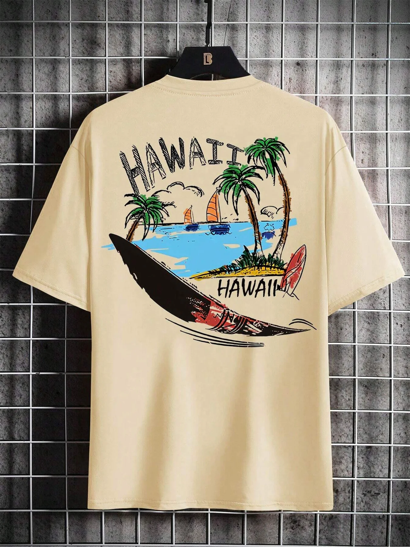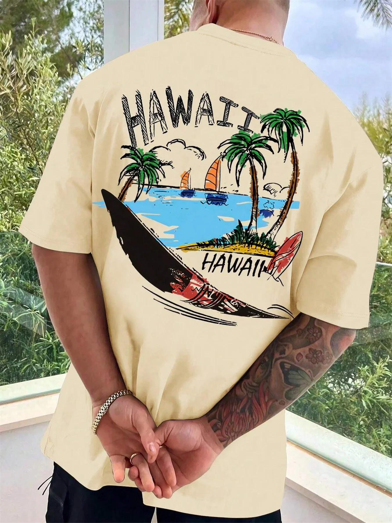 Summer men’s 100% pure cotton casual loose size Holiday beach print sports comfortable round neck short sleeved T-shirt top